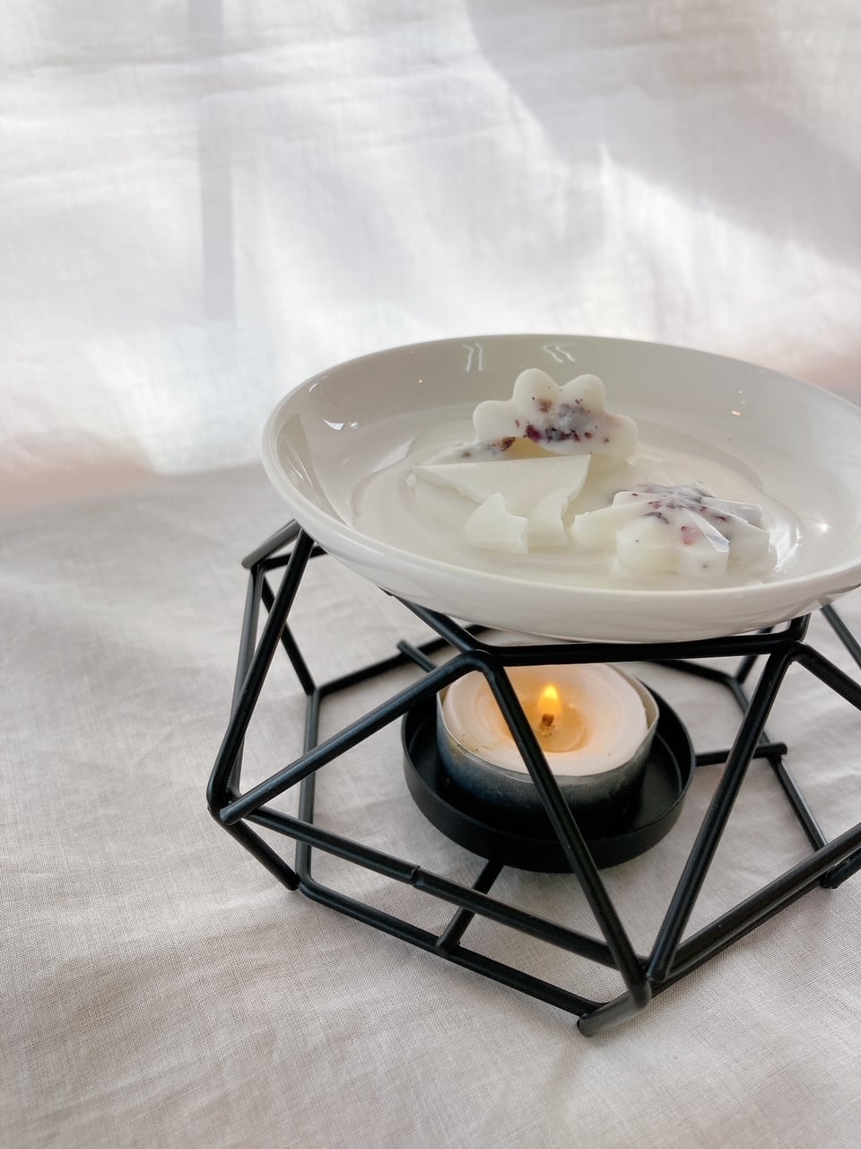ポットにワックスメルトを数個入れ、ティーライトや電気キャンドルで温めると、香りが広がります。部屋全体を包み込むリラックス空間が演出できます。